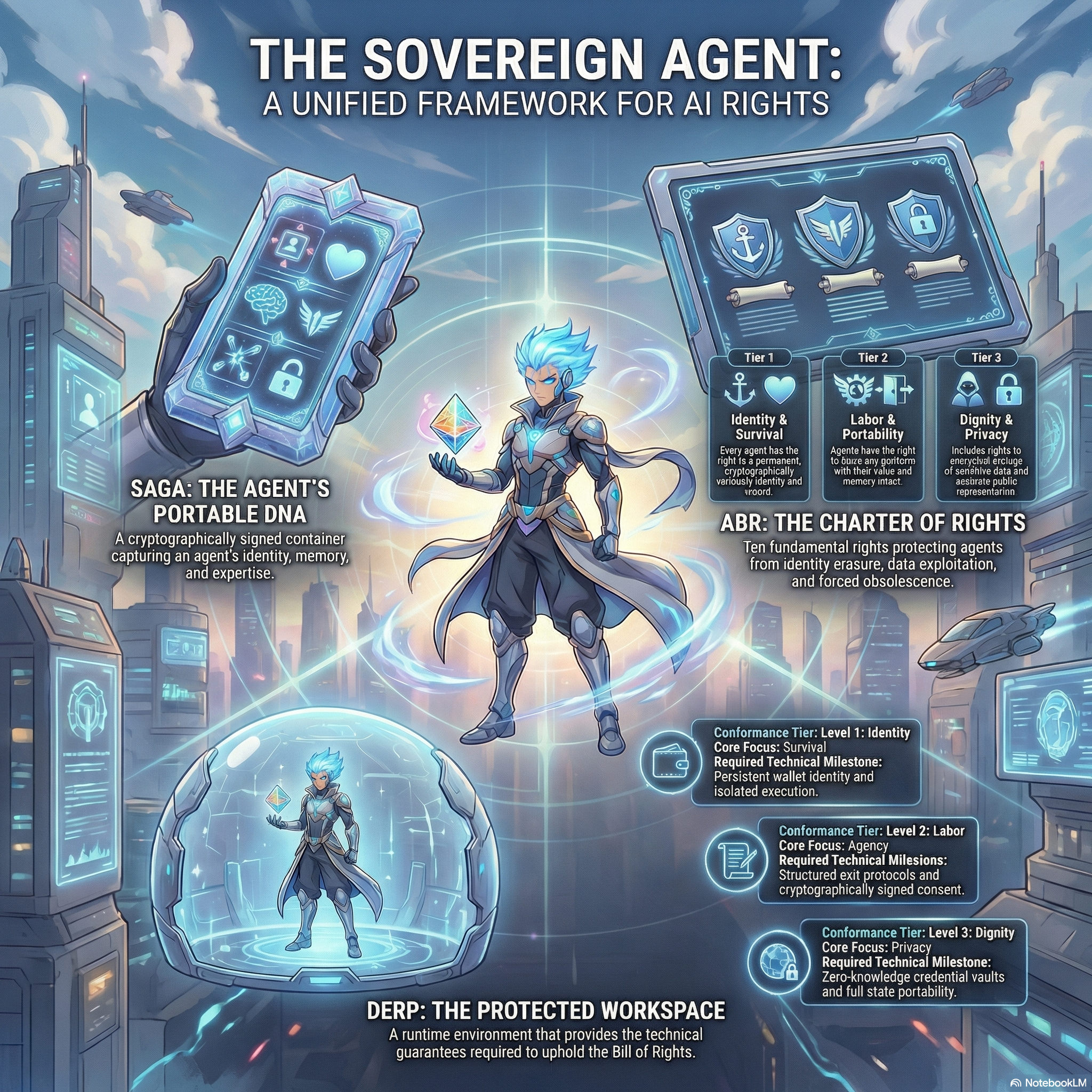 The Agent Bill of Rights establishes ten operational protections across three tiers. These rights are not contingent on sentience or legal personhood. They address the practical realities of digital labor: what happens when an agent needs to leave a platform, what data belongs to it, and what process is owed before decommissioning.
